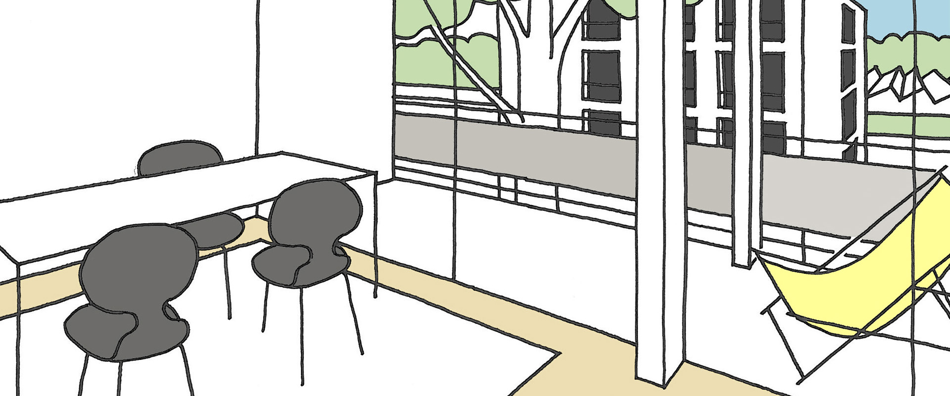 Es entsteht ein Wohnungsmix aus Zwei-, Drei- und Vierzimmerwohnungen mit 30% geförderten Wohnungen. Die modulare Struktur ist in den späteren Innenräumen nicht mehr erkennbar. Die adaptiven Holz-Raummodule erlauben die Realisierung von lichtdurchfluteten Wohnungen mit großzügigen, fließenden und offenen Räumen.