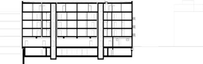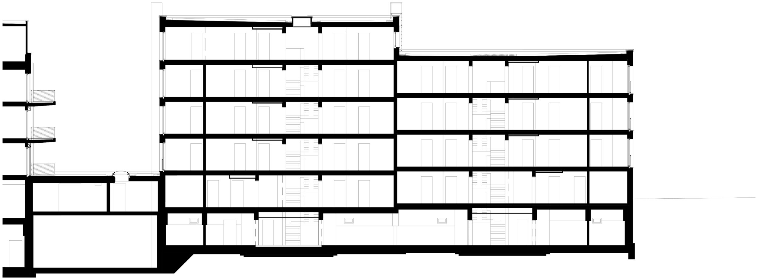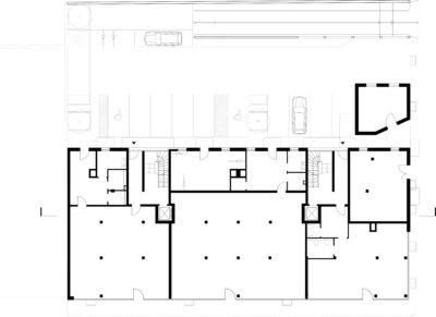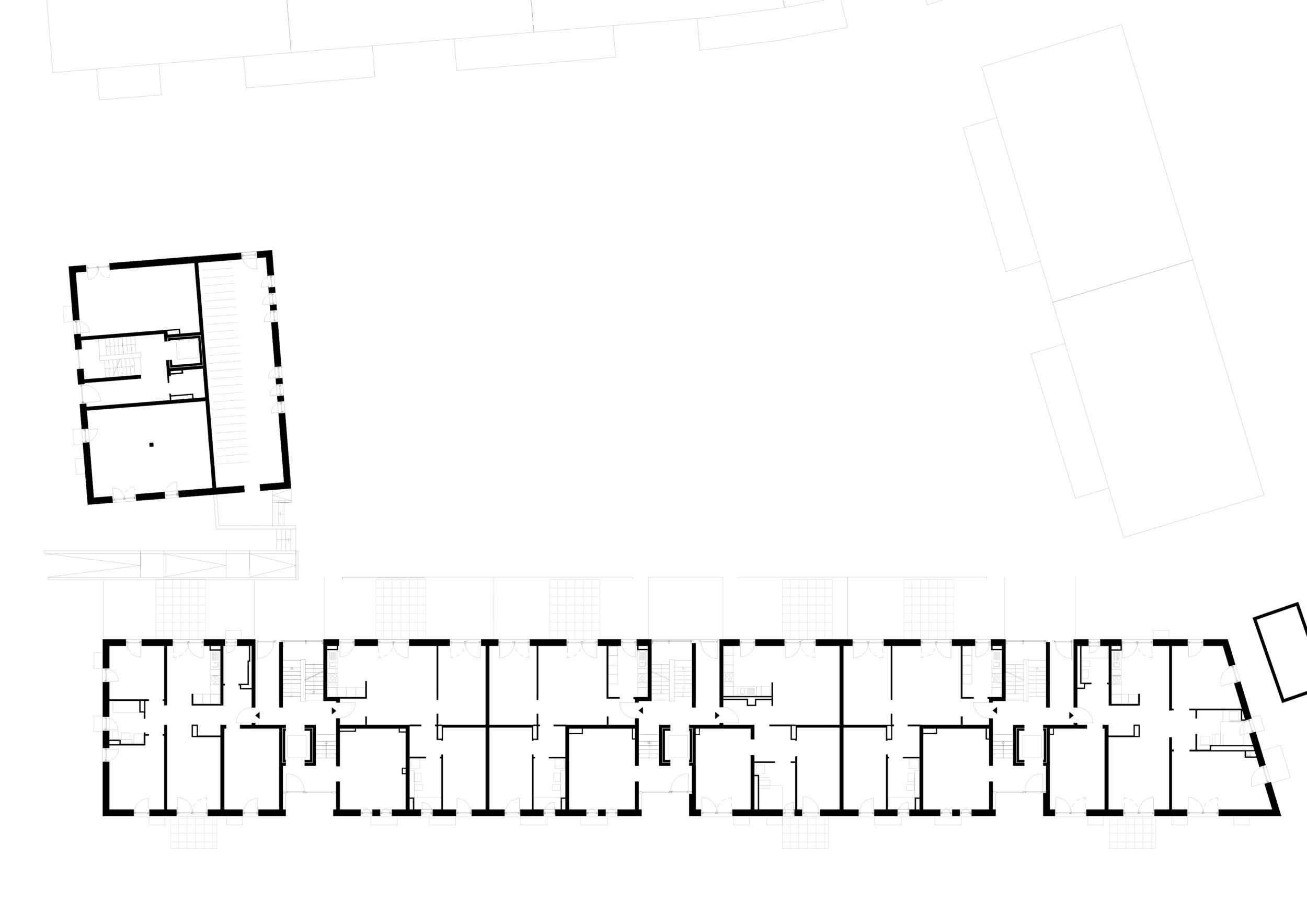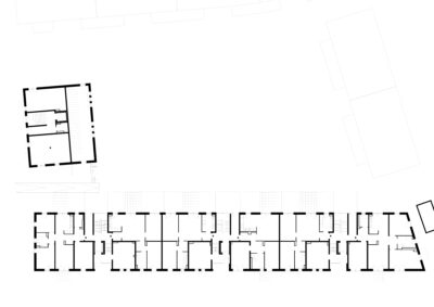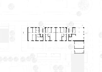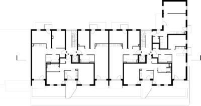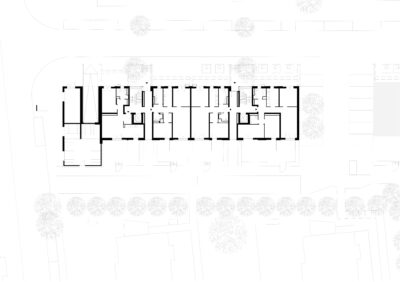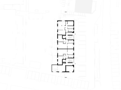 Zwischen den Studenten und den Senioren befindet sich das Haus mit den Pendlerwohnungen. Im Erdgeschoss liegt, nach Westen und zum Grünraum im Blockinnern hin ausgerichtet, ein von allen genutzter unterteilbarer Gemeinschaftsraum.