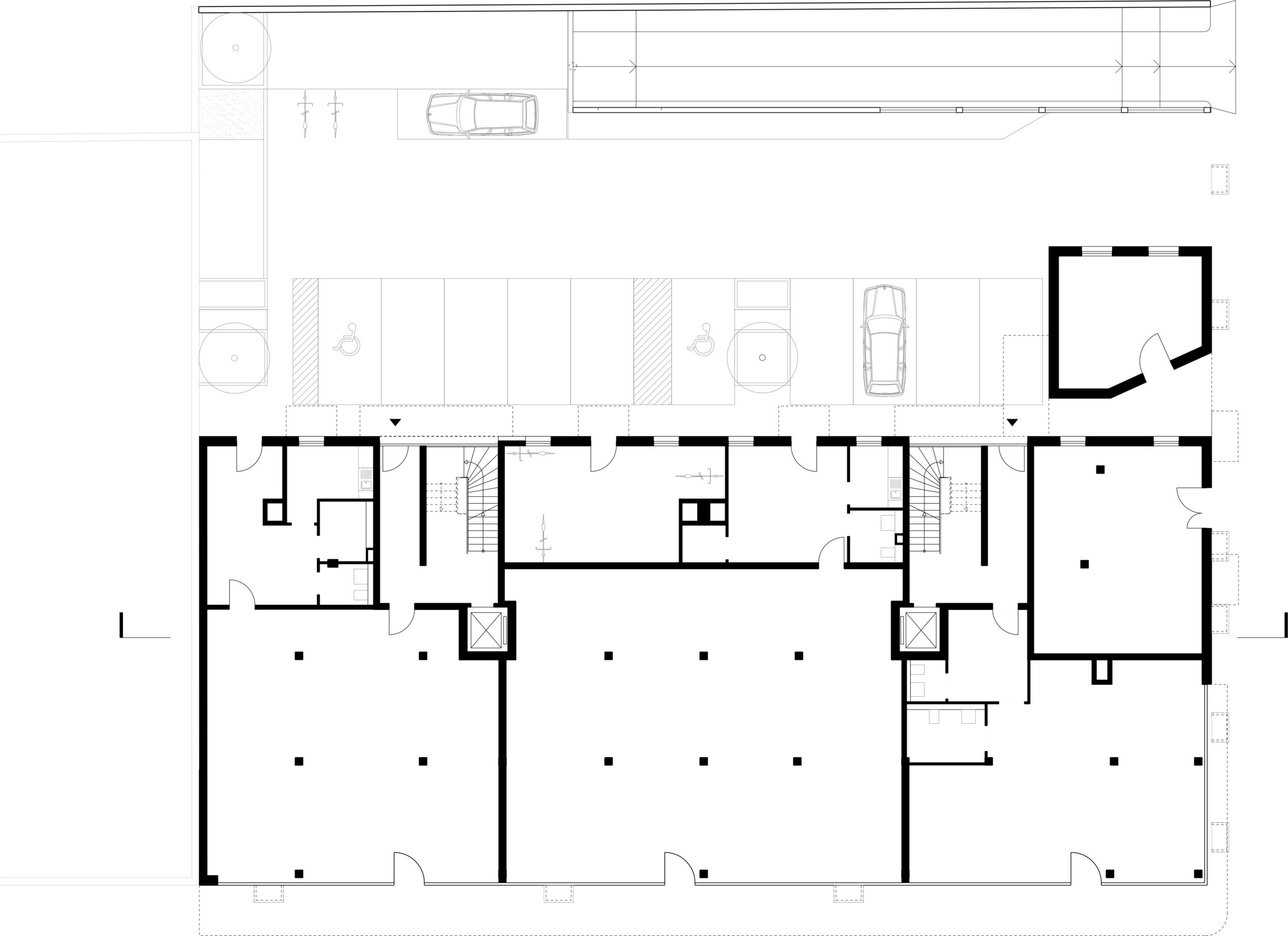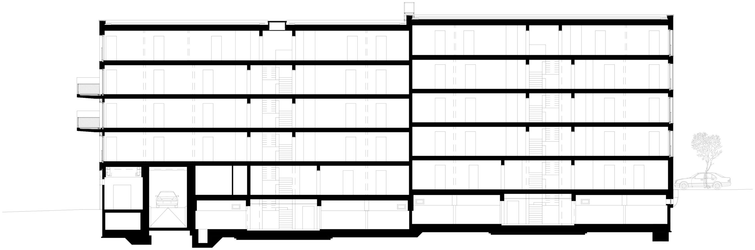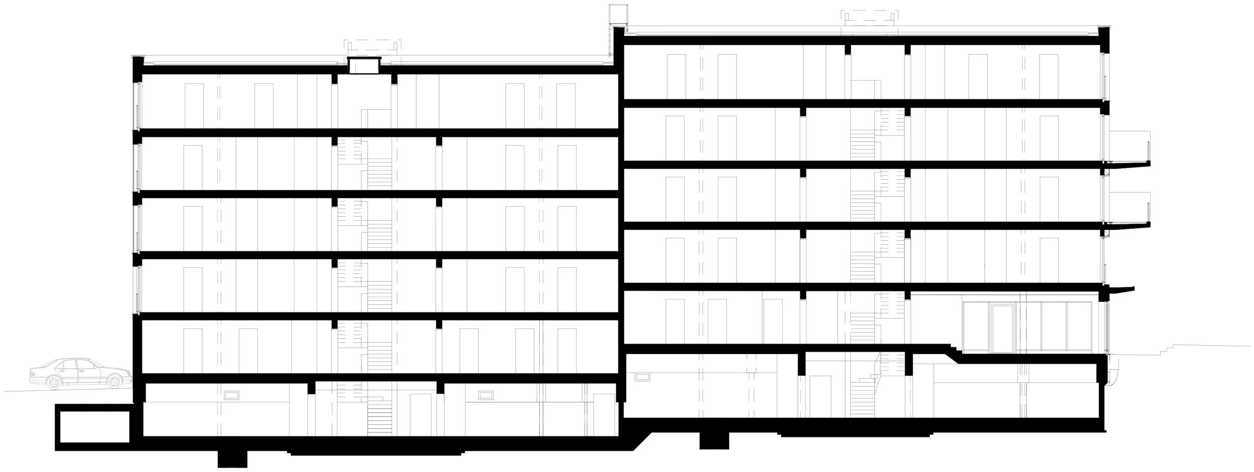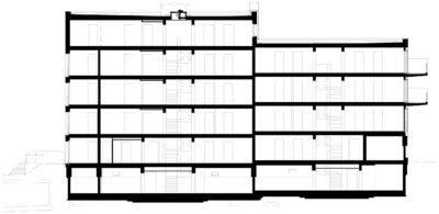 Auf der Südseite ist unter Ausnutzung des natürlichen Gefälles ein halb eingegrabenes Untergeschoss eingeschoben, das die Technikräume, die Waschräume, den Fitness- und den Musikübungsraum sowie die Garagen für Fahrräder und Autos aufnimmt.