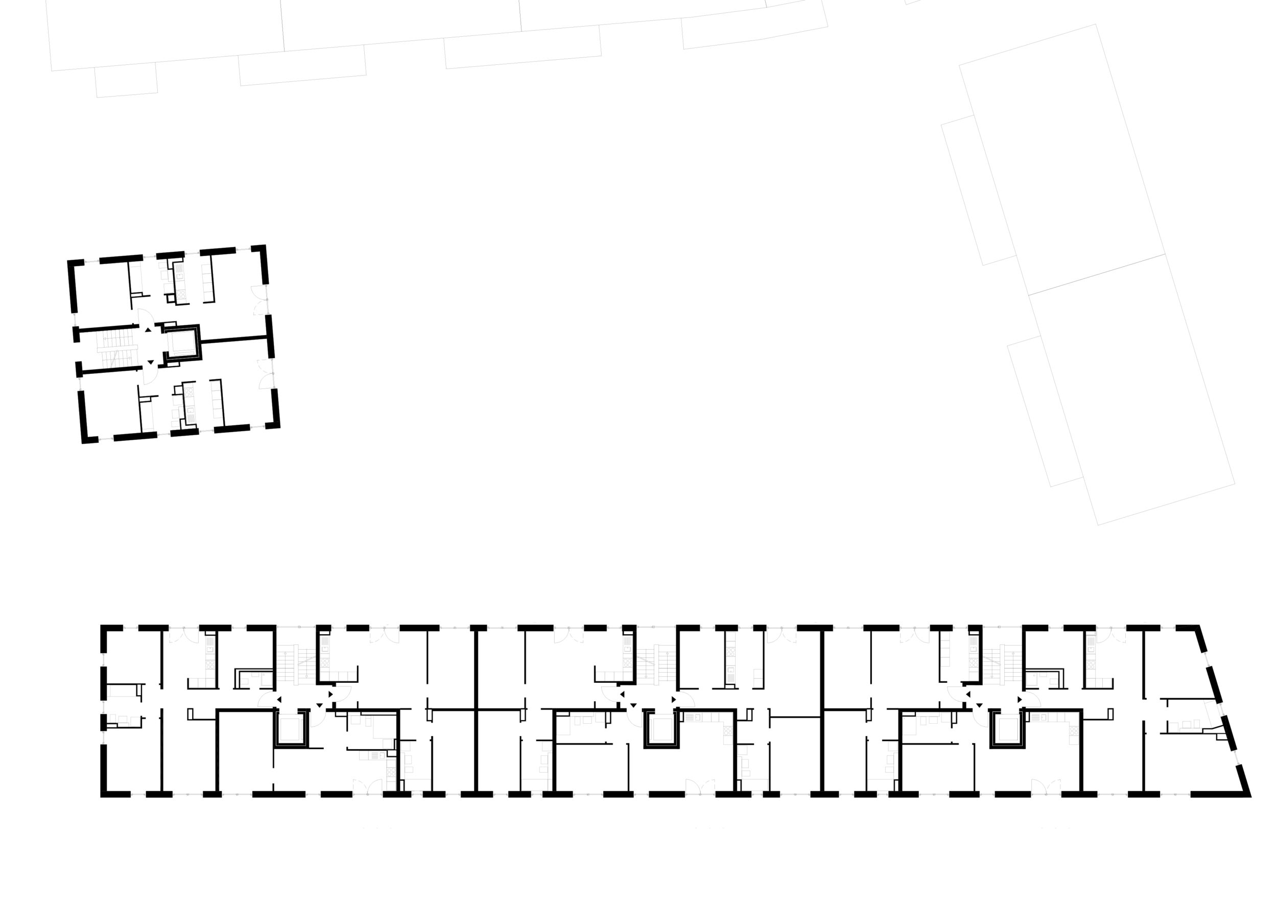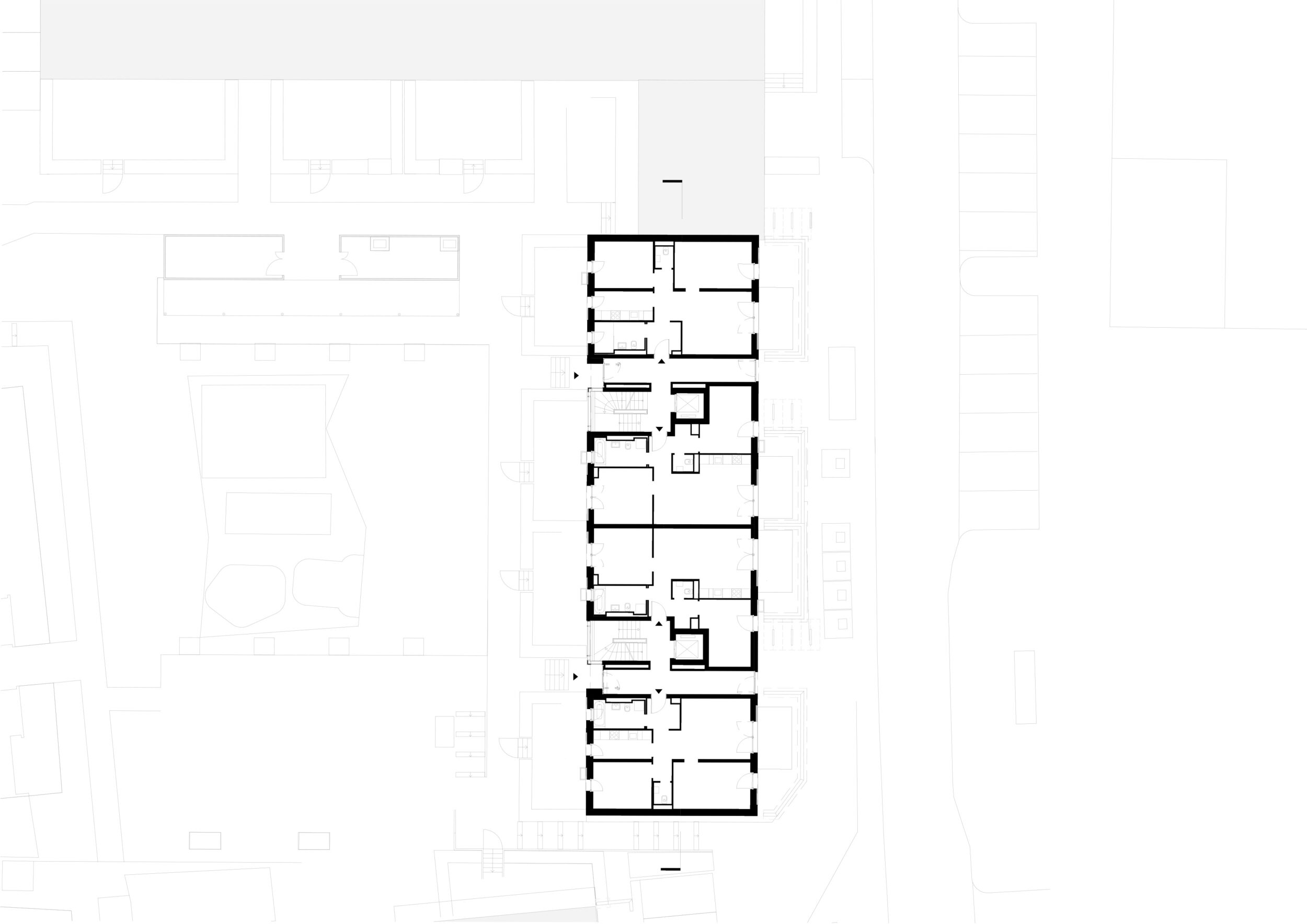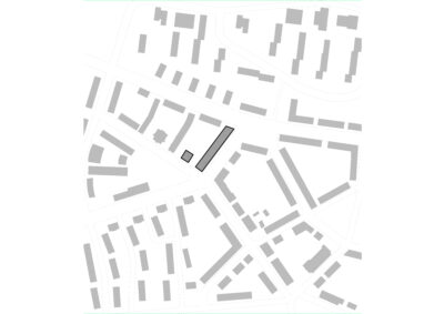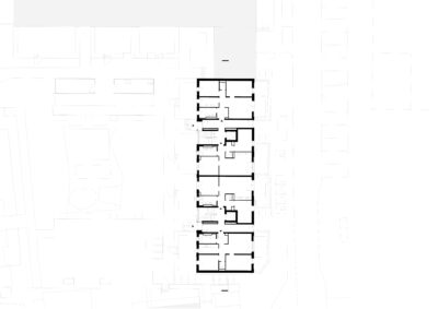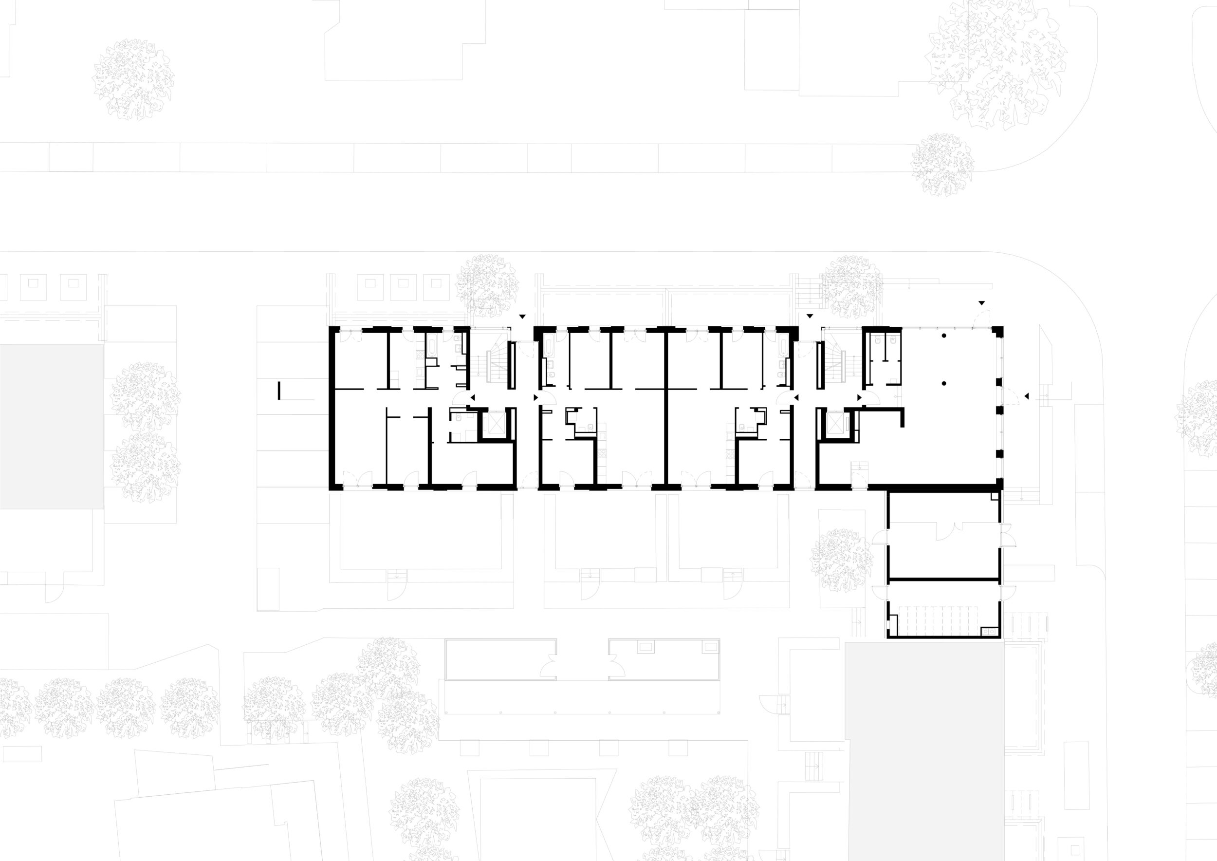 Das tiefe Grundstück wird mit einzelnen Häusern für Studenten, Pendler und Senioren bebaut. Die Kommunikation untereinander wird dadurch ermöglicht, ohne dass sie erzwungen wird. Das Projekt ist auch für kinderfreundliches Familienwohnen geeignet.