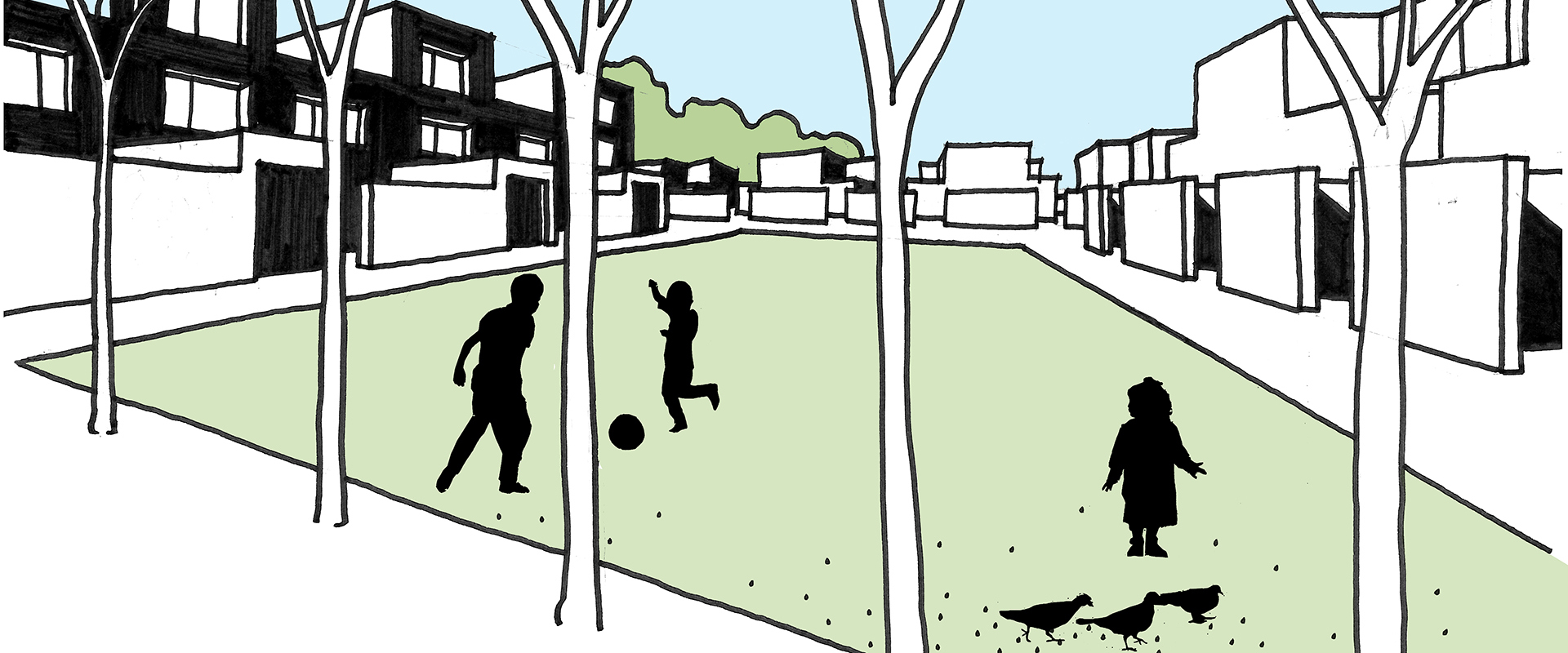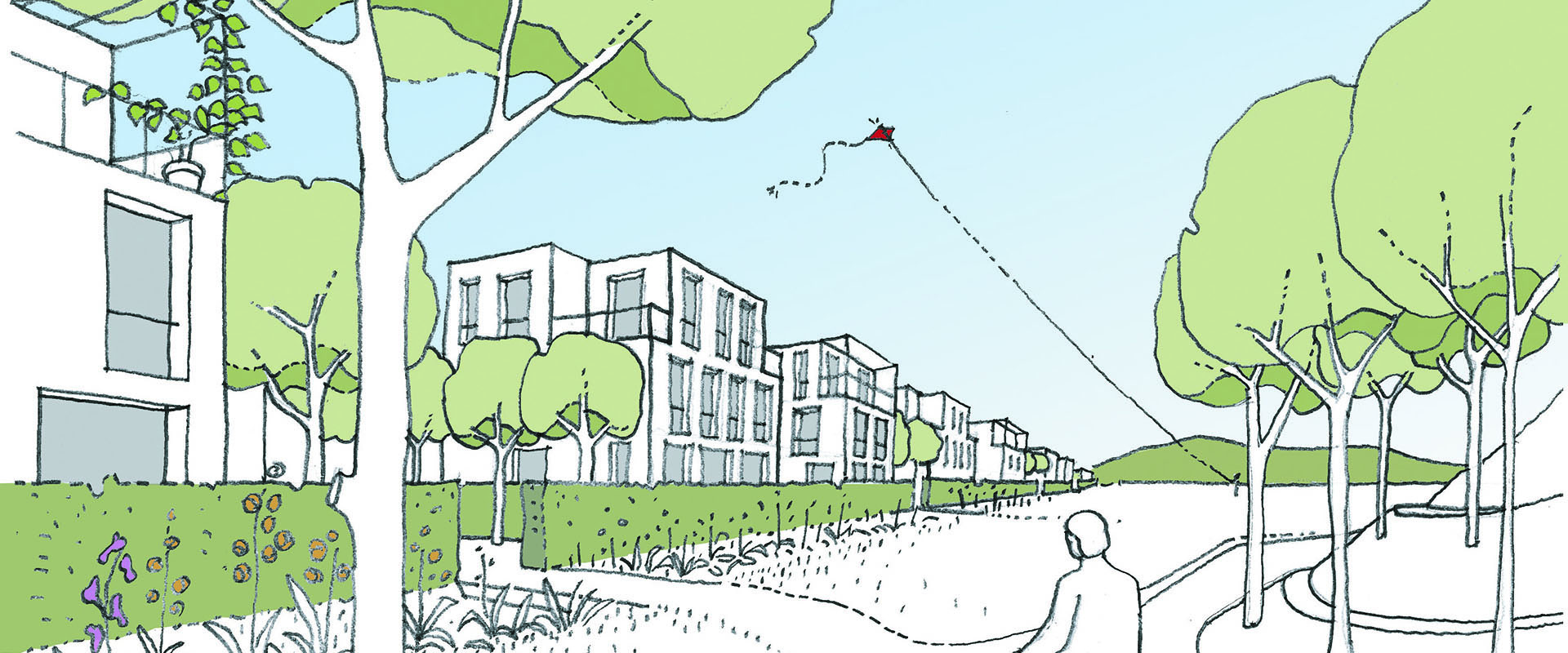 Der Freiraum zwischen Vorder- und Hinterhaus dient als grüne Oase. Hier können sich die Bewohner, abgeschirmt vom Treiben auf der Straße und der nahegelegenen S-Bahnstation, ein Sonnen- oder Schattenplätzchen suchen und zwischen Sträuchern, Blumen und Bäumen den Tag ausklingen lassen, einen Kindergeburtstag feiern oder einfach nur ein Buch lesen. Zusätzlich zur begrünten Innenhofgestaltung tragen die Fassadenbegrünung am Treppenhaus, die Vorgärten und die begrünten Dächer (mit Regenrückhaltung) zu einem angenehmeren Mikroklima bei.