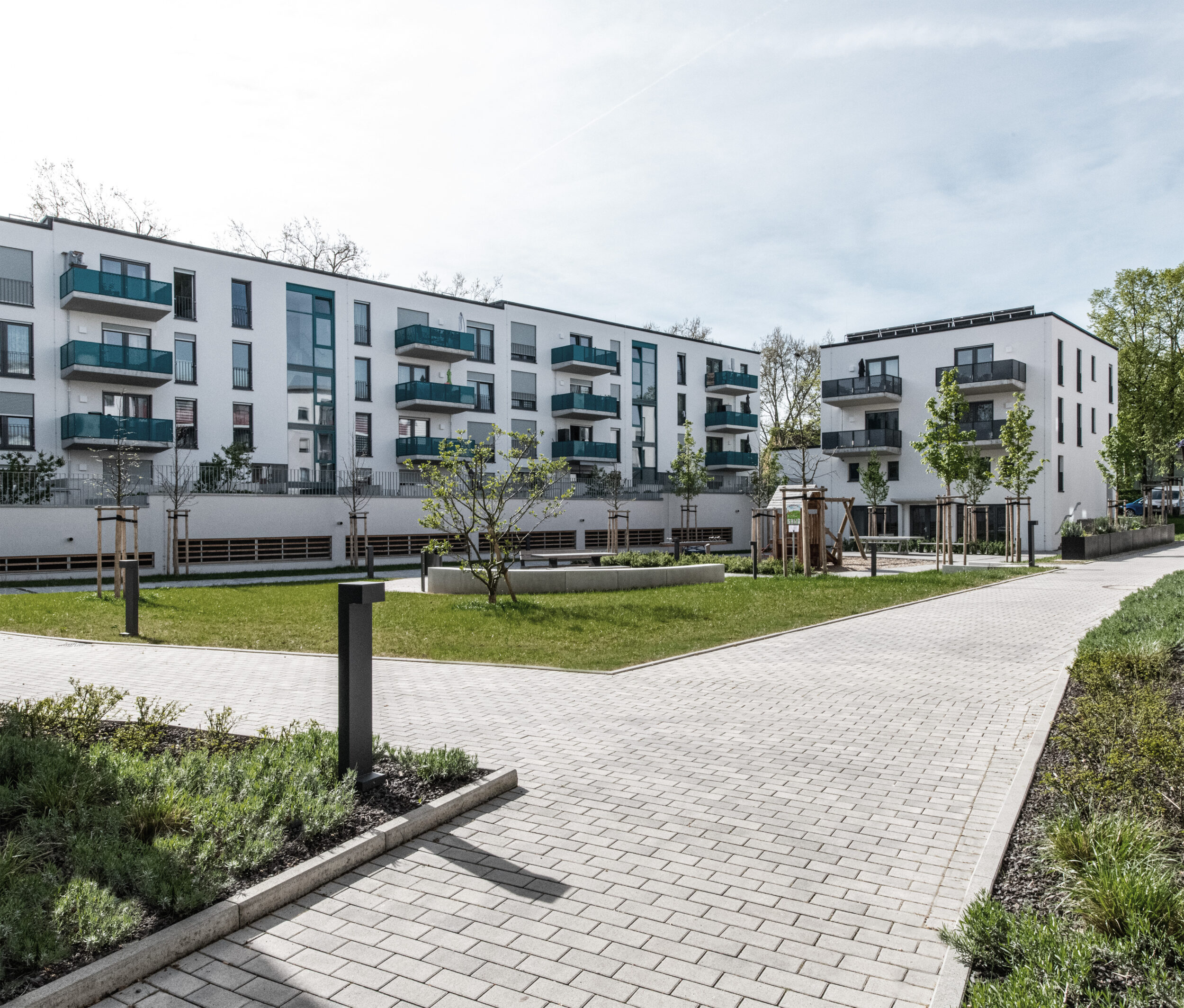 Die zwei Neubauten sehen einen Wohnungsmix von 2- bis 4-Zimmerwohnungen vor, wovon jeweils die Erdgeschosswohnungen barrierefrei und mit Anschluss an einen privaten Vorgarten konzipiert, worden sind. Die Wohnungen in den Obergeschossen haben ebenfalls Zugang zu einem Freisitz in Form eines Balkons nach Süden oder Westen.